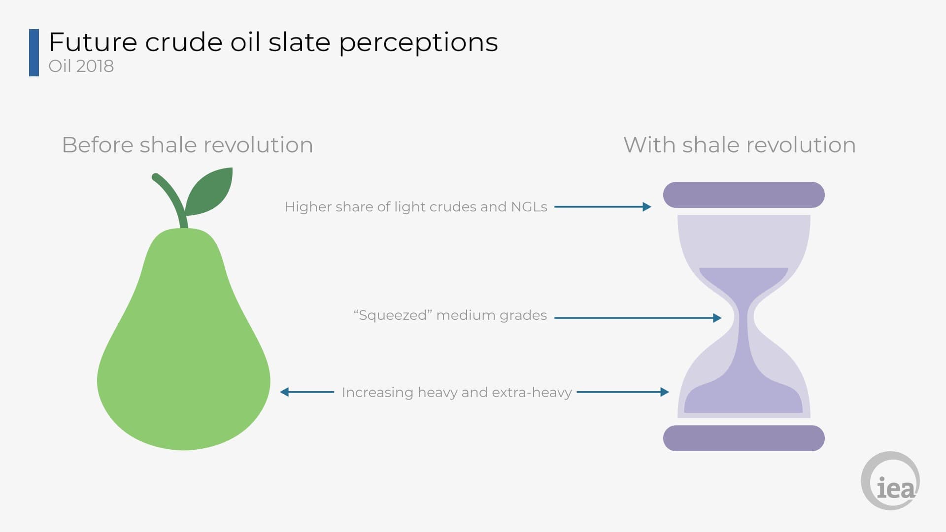 IEA称,由于页岩气革命之前,炼油行业一直在计划中型和较重类型的石油,因此预计未来石油供应的预期格局将是梨形的。也就是说,混合物将由桶底大量的较重油供应组成。
