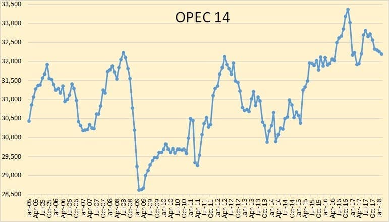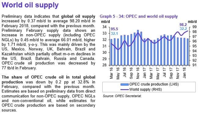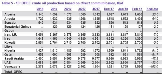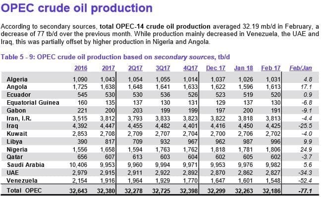 MarchOPEC每月石油市场报告包含2月份的产量数据。所有数据截止到2018年2月,以每天千桶为单位。