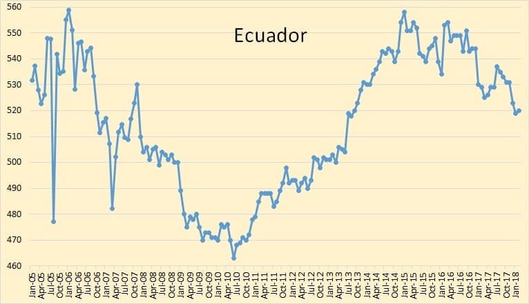 厄瓜多尔2月份的日消费量不足千桶,但自2015年触顶以来,跌幅仍在继续。
