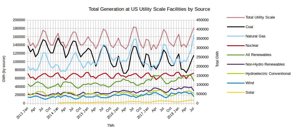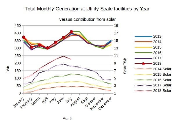 下图显示了每年公用事业规模设施的月总发电量与太阳能的贡献量。左手的刻度用于总发电量,而右手的刻度用于太阳能输出,并且故意将其设置为夸大太阳能输出,以评估其潜力,为仲夏高峰做出有意义的贡献。y轴的刻度已调整为显示TWh,而不是Dennis(Coyne)今年早些时候建议的GWh,从而使比较更加容易。2018年7月,太阳能产量为10,049 GWh,是四年前2014年7月的3.64倍。太阳能似乎在夏至月份的6月达到了顶峰,因此,看起来2018年的月度峰值产量可能为10,880 GWh,除非极少有机会在8月发电。