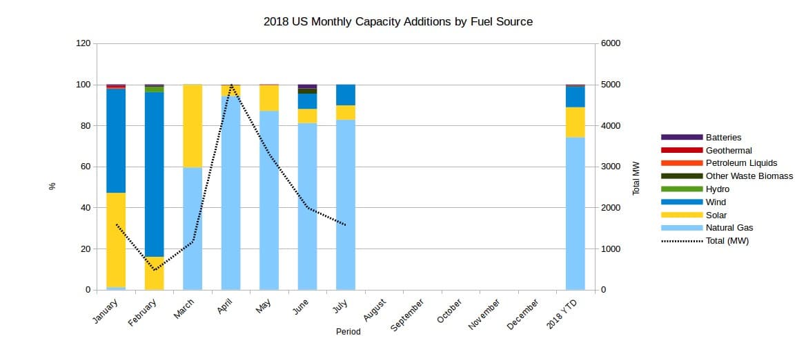 下图显示了2018年的每月产能增加量。7月,天然气贡献了新产能的82.78%。七月,天然气,太阳能和风能的新增装机容量中有7.45%来自风能和太阳能,占6.85%,天然气,太阳能和风能占新容量的近99.94%。
