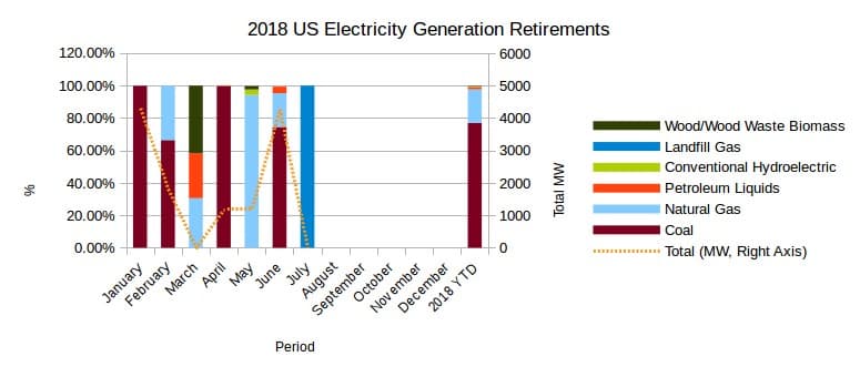 下图显示了到目前为止2018年的每月产能退役。7月,唯一的退役是三台由内燃机驱动的,由垃圾填埋气提供燃料的机组,马里兰州的两台1 MW机组和德克萨斯州的1.7 MW机组,总计3.7 MW。