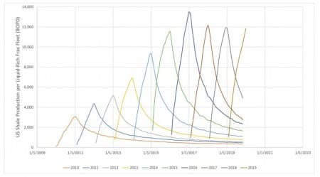 在下一个图表中,事情变得很有趣,因为它需要该数据并逐年关注该数据。您可以看到,从大多数人都说“页岩革命”开始的2009年到现在,产量一直在增加。从2009年的1,500 BOPD到2017年的12,000 BOPD以上。它还表明,自2017年以来,每个车队的生产率一直处于稳定状态,或开始略有下降。