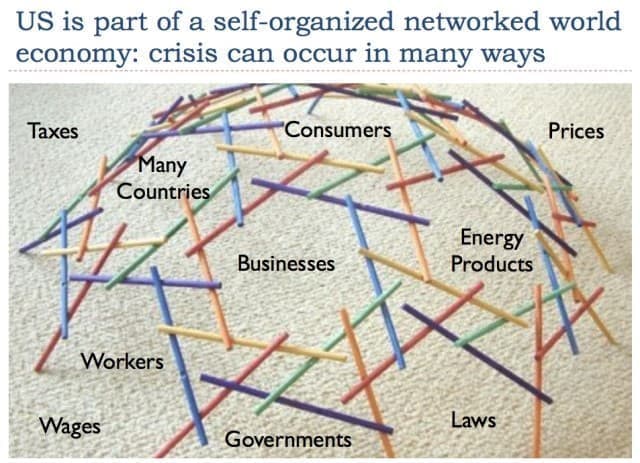 即使我们想摆脱汽车并重回赛马场,我们现在确实还不能这样做。从某种意义上说,幻灯片5所示的结构是空心的,因为不再需要的现有功能往往会消失。经济的空心性使得如果我们以某种方式失去了现有的能力,几乎就不可能倒退-没有足够的石油,电力问题,国际贸易问题或金融问题。相反,我们将需要建立在新环境下运行的新系统:资源枯竭,人口水平很高,污染水平很高以及土壤退化。现有的自组织系统可能会崩溃到只能维持的部分。