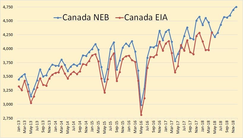 该图表中的EIA数据截止到4月,而美国国家能源委员会的数据截止到2018年12月。EIA数据通常低于NEB数据,但它们都同意4月份的产量。
