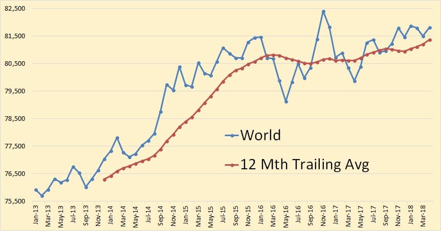 美国至2018年5月。过去两个月来,上升趋势一直停滞不前。美国5月份产量下降30,000桶/天。