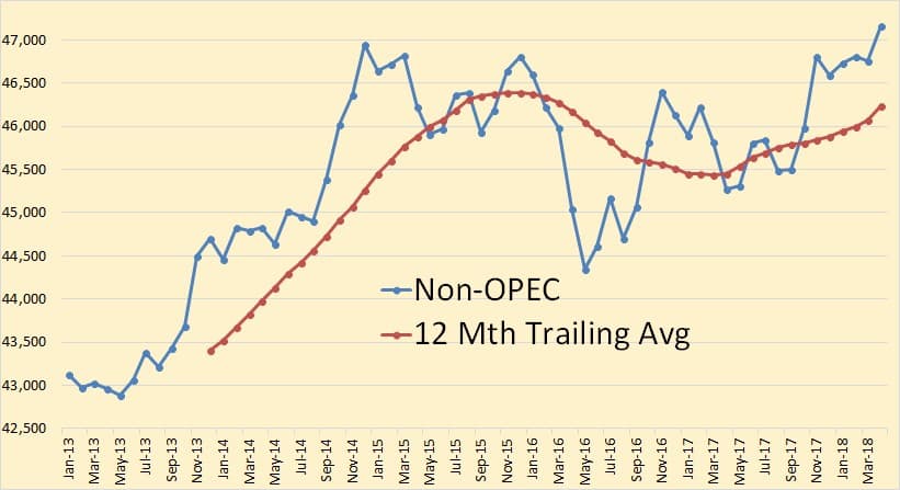 非欧佩克产量在4月达到新的高峰,增长405,000桶/天,至47,159,000桶/天。其中涨幅最大的是加拿大,上升317,000桶,英国,上升111,000桶。