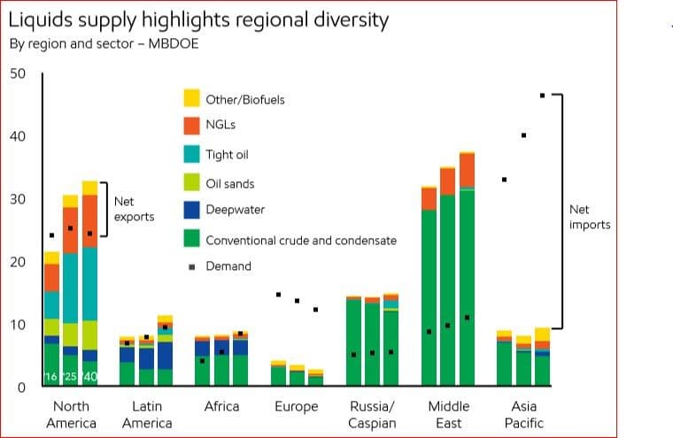• 到2040年,中东和俄罗斯/里海仍然是主要的石油出口国,非洲转向进口国