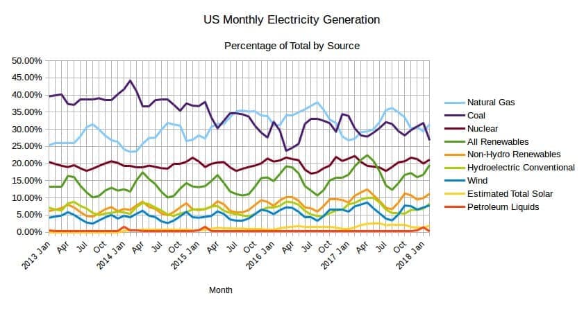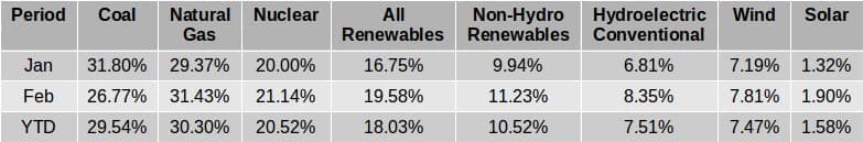 EIA于4月24日发布了最新版的《电力月报》,其中包含2018年2月的数据。上表显示了最近两个月主要燃料来源占小数点后两位的百分比。