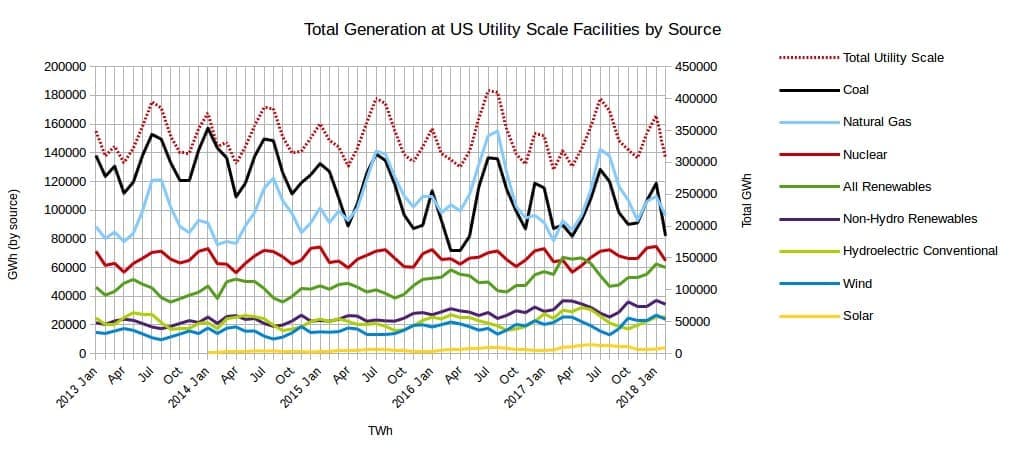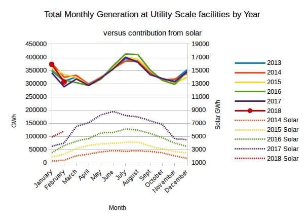 下图显示了公用事业规模设施的年月总发电量与太阳能的贡献量。左手的刻度用于总发电量,而右手的刻度用于太阳能输出,并且故意将其设置为夸大太阳能输出,以评估其潜力,为仲夏高峰做出有意义的贡献。2018年2月,太阳能发电量为5812 Gwh,是四年前2014年2月的4.2倍。如果夏季产量继续遵循最新趋势,那么今年夏季某个时候的一个月内,将产生近12,000 GWh的发电量。
