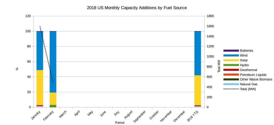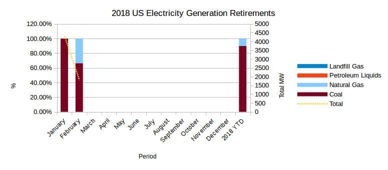 下图显示了到目前为止2018年的每月产能退役,其格式更改与上图相同,原因相同。2月,退休的66.45%为燃煤电厂(1208兆瓦),天然气为31.55%(610兆瓦)。