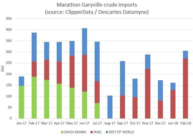 随着沙特阿拉伯重新流向美国,我们看到了对几个主要目的地的进口量的变化。在去年头七个月向马拉松的加里维尔炼油厂平均发送了14万桶/日的石油之后,交货已经完全枯竭。