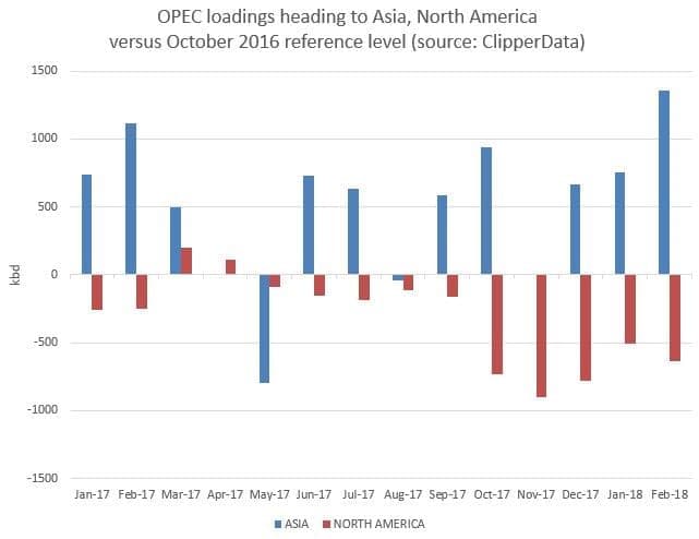 我们下面的ClipperData对此进行了说明,强调了过去14个月中有12个月运往亚洲的OPEC装载量如何高于2016年10月的参考水平,在此期间平均增加了超过500,000 bpd。这些流量上个月达到了最高差额,增加了140万桶/天。
